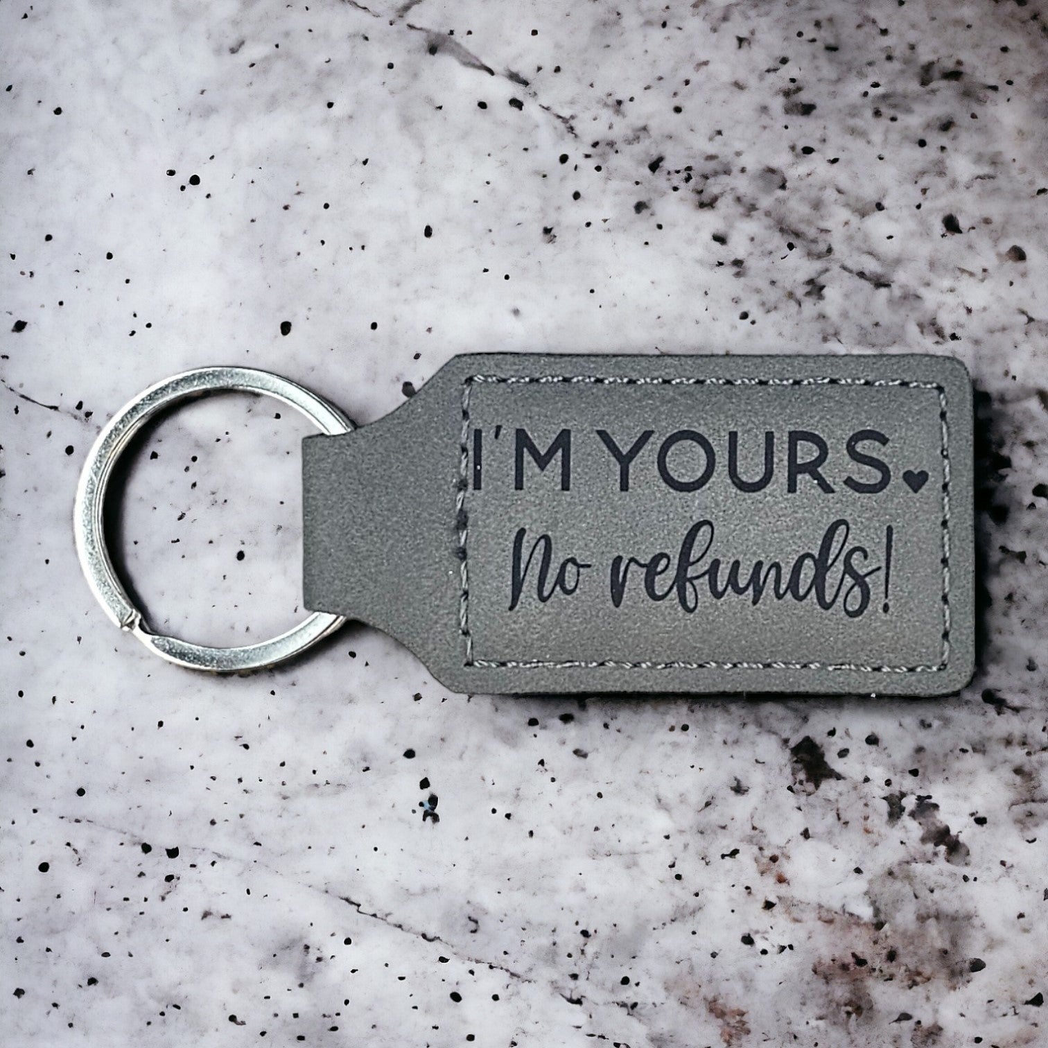 "I'm Yours, No Refunds" is engraved onto these PU leather-look key rings with smart matching stitching. Manufactured from a unique PU that changes colour when it is laser engraved. The black key ring engraves to silver and the brown, tan and grey key rings engrave to black. Each key ring is individually boxed.