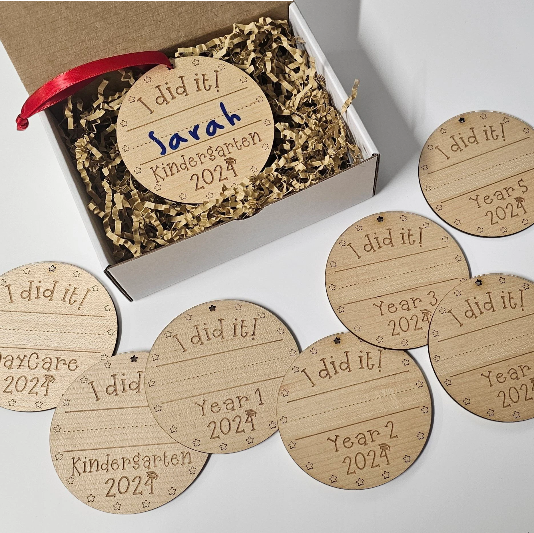 These kids handwriting keepsake ornaments are the perfect way to keep track of how your kids handwriting evolves each year! These are laser cut and engraved from a wooden veneer. We've used a permanent marker on the example in the photo. Please ensure you don't touch the writing for at least 2 - 3 minutes after it's been written, until the ink dries (just to ensure it doesn't smear).