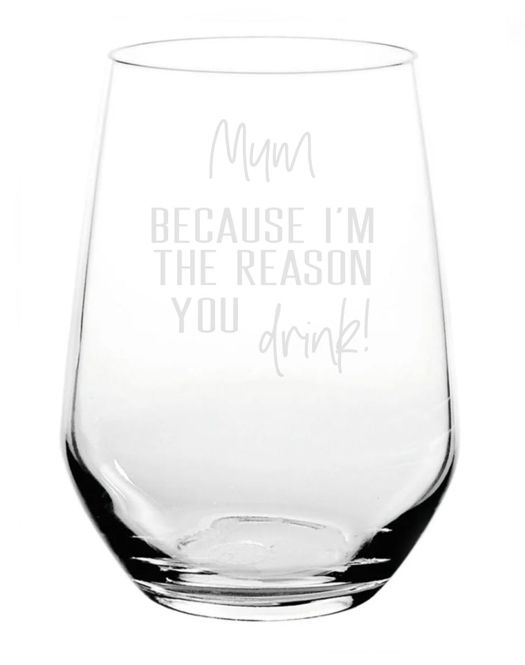 Mum, Because I'm The Reason You Drink - Laser Engraved Stemless Wine Glass with Gift Box