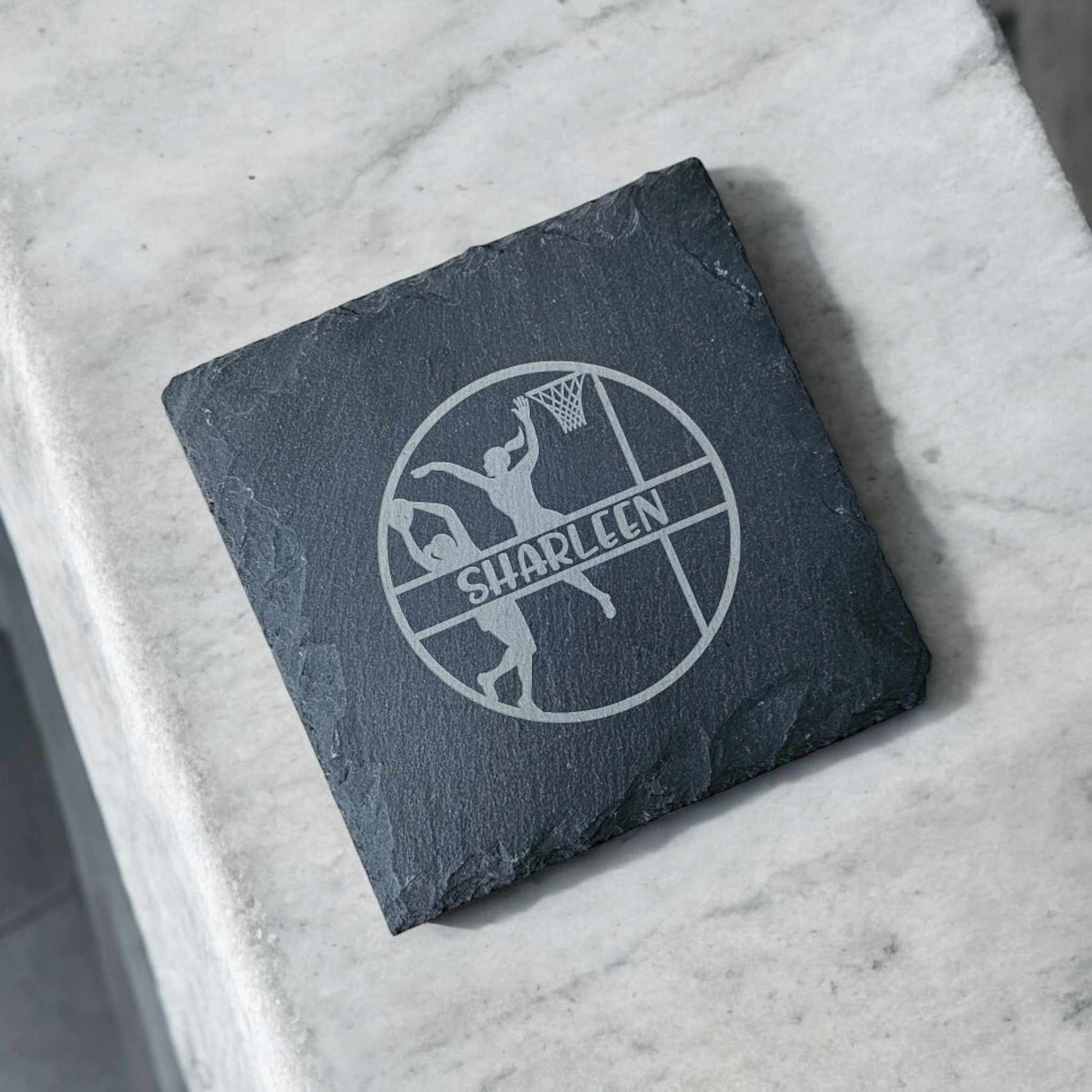 Add a touch of personality and style to your home or gift with our Personalised Slate Coasters. Perfectly sized at 100mm x 100mm, these premium slate coasters are engraved with the recipient's name and customised with a netball themed image.