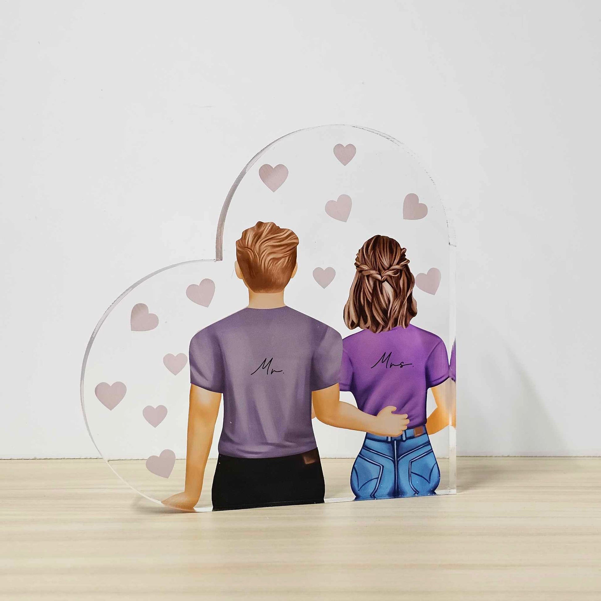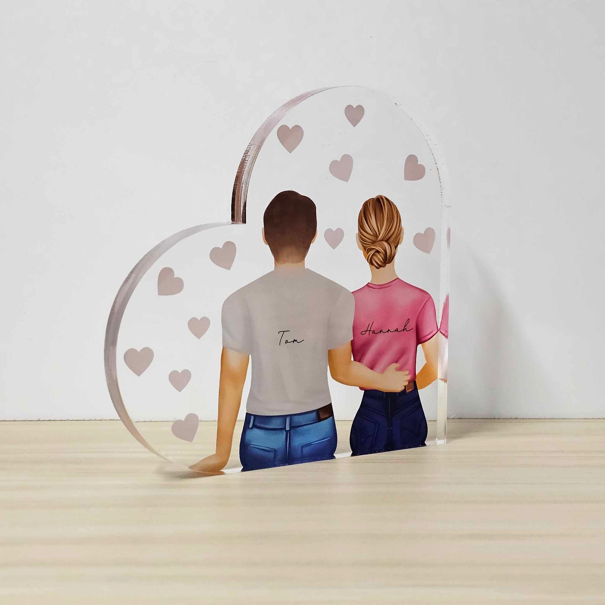 Celebrate your love with a unique and personalised keepsake! Our Personalised Couples Acrylic Freestanding Heart features a custom design of you and your representation of you and your partner, created by selecting options like hair colour, hairstyle, t-shirt colour, and more.