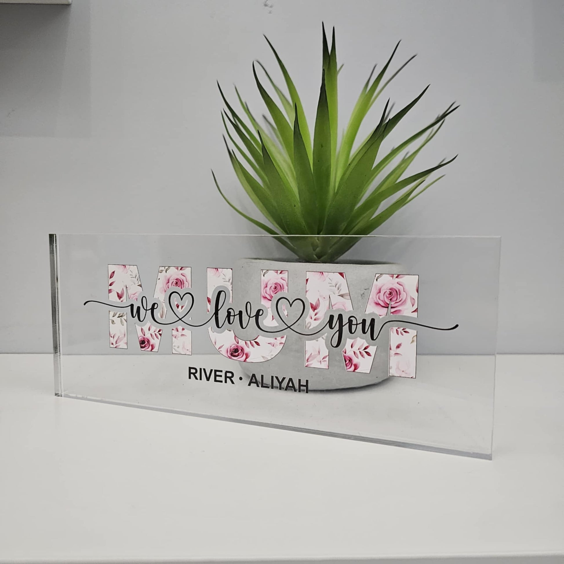 Celebrate the love of family with our personalised floral acrylic blocks, a stunning keepsake designed to honour the special women in your life. Each freestanding clear acrylic block is custom printed with a bold floral “feature word” such as Mum, Nana, Gran, or any name or title of your choice.