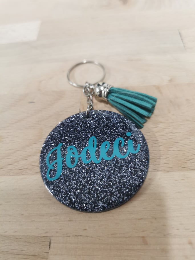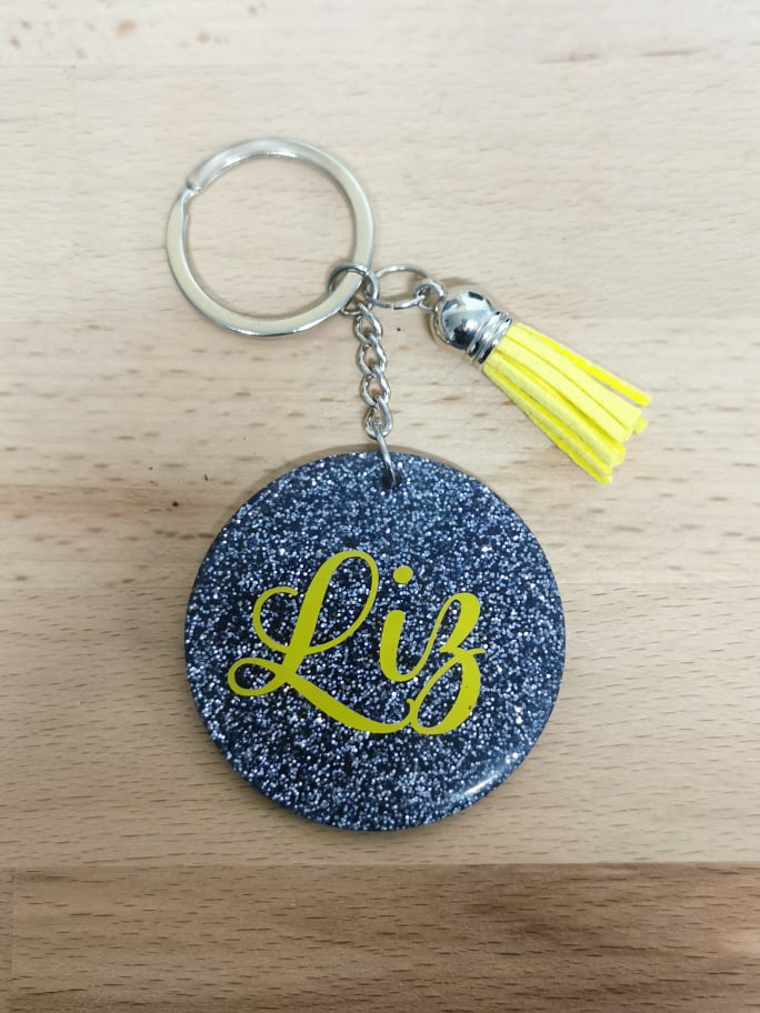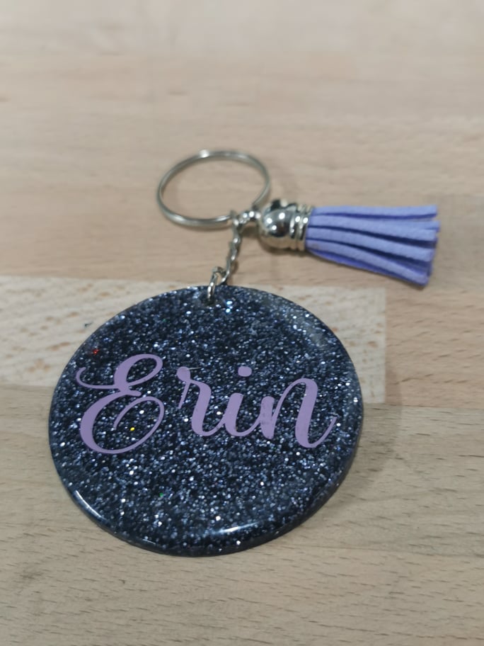 An acrylic keychain, personalised with any name which is then sealed under a layer of resin so it won't come off. The standard width for the disc of these keychains is 2inches, however we will go bigger if required (for longer names).