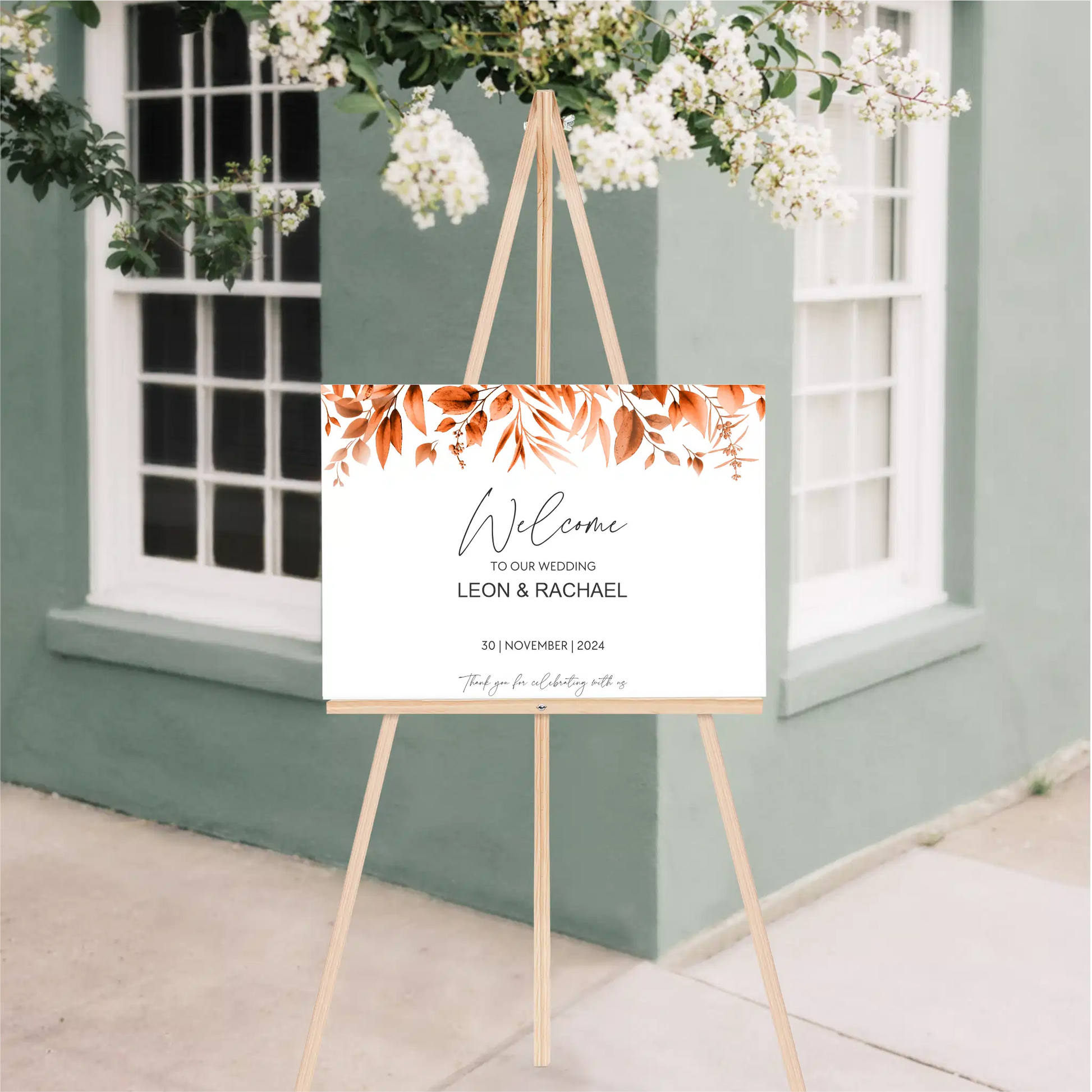 This stunning autumn leaves Welcome to our Wedding sign is direct printed onto 3mm thick white acrylic.